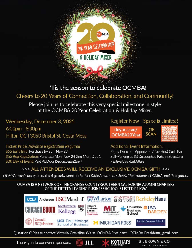 Join us for this special holiday mixer as we also celebrate the 20th anniversary of OCMBA!