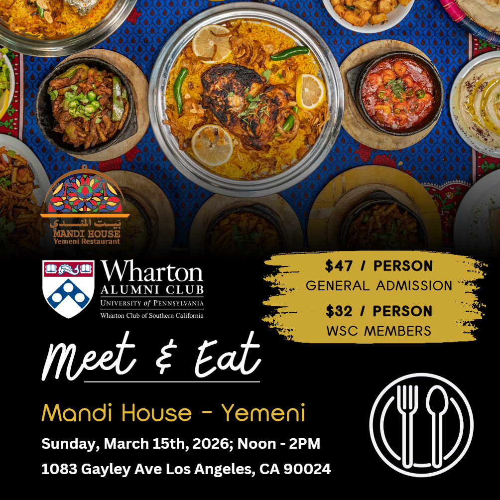 Calling all Foodies! Join us for our “Meet & Eat” series, a culinary adventure celebrating local businesses and cultural diversity. Connect with fellow Wharton alumni and friends while enjoying a delightful array of delectable dishes, each a masterpiece of flavor and creativity.